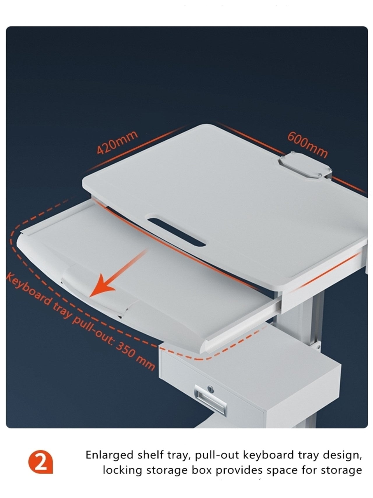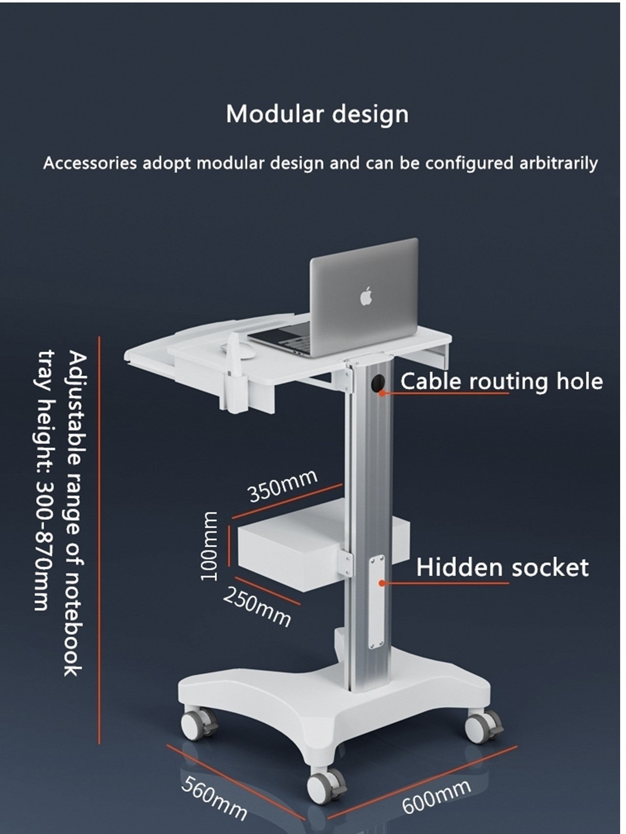 The height-adjustable medical cart can be used while sitting or standing, designed with ergonomic principles in mind.Hidden sockets make cables and sockets no longer cluttered. The modular design allows for flexible assembly of storage baskets or trays as desired.